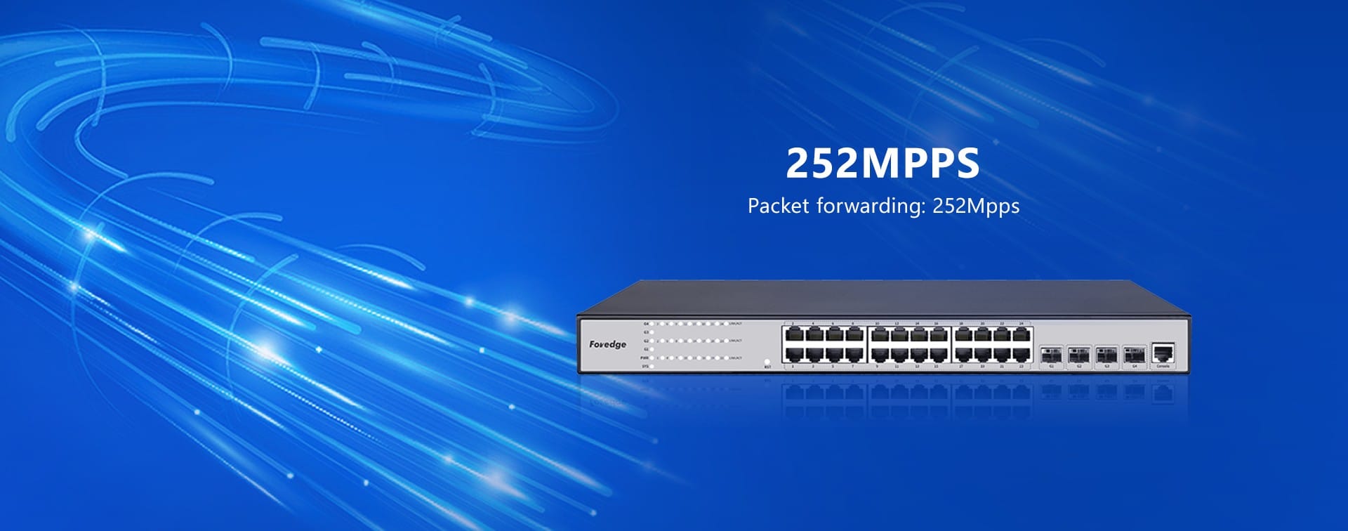 พอร์ตเครือข่าย RJ45 Gigabit เต็มรูปแบบจำนวน 24 พอร์ต และพอร์ตไฟเบอร์ออปติก Gigabit SFP จำนวน 4 พอร์ต