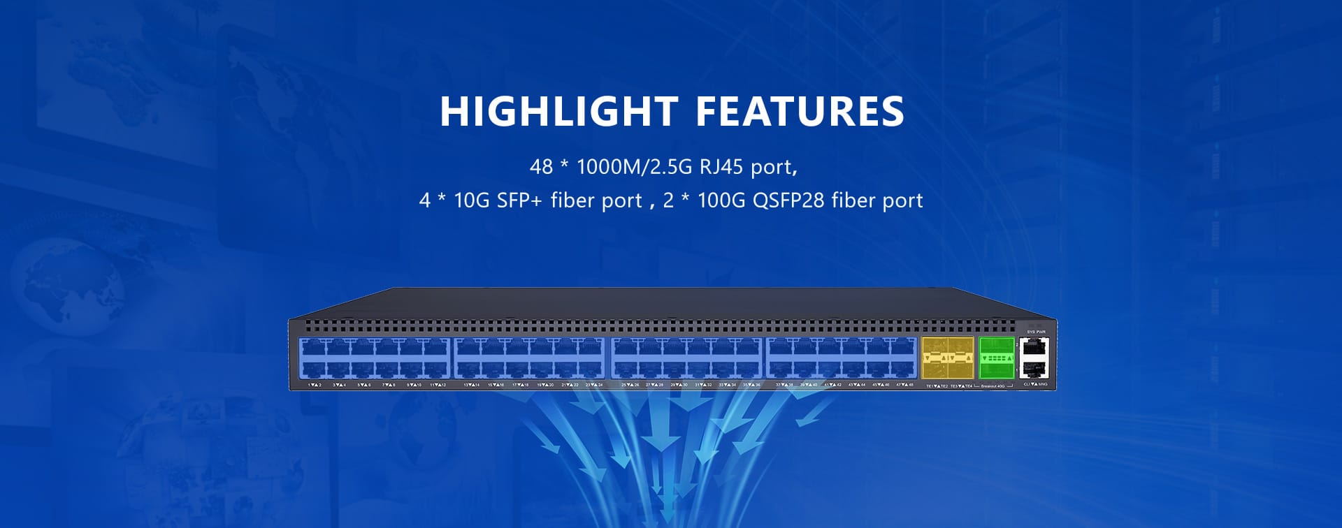 พอร์ต RJ45 ความเร็ว 1000M/2.5G จำนวน 48 พอร์ต, พอร์ตไฟเบอร์ 10G SFP+ จำนวน 4 พอร์ต, พอร์ตไฟเบอร์ 100G QSFP28 จำนวน 2 พอร์ต